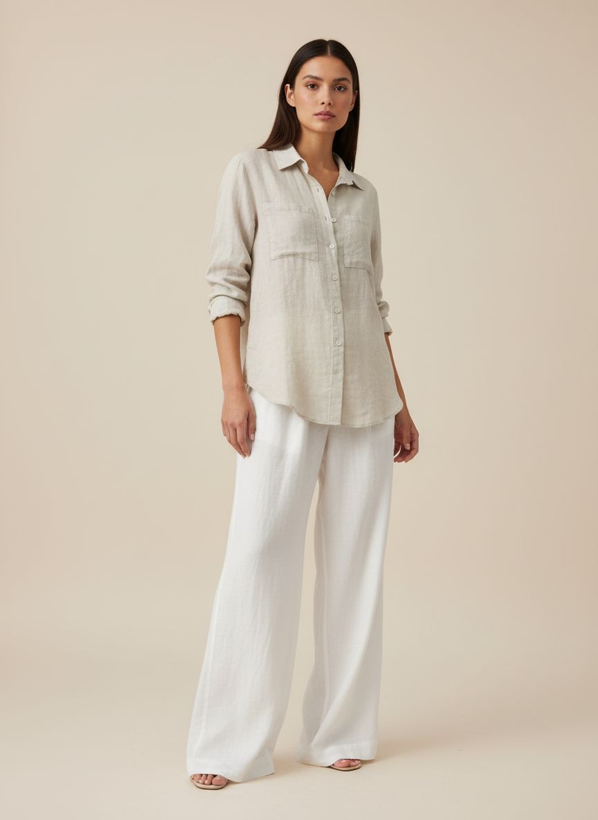 Camisa de lino para mujer, de corte amplio y silueta relajada, diseñada para usar en todo momento con mucha comodidad y frescura. Su estilo clásico incluye cuello camisero y cierre frontal con botones, resaltando la elegancia natural del lino sin detalles adicionales como bolsillos, para un look limpio y minimalista. Versátil y ligera, es perfecta para combinar con pantalones, faldas o shorts, ideal tanto para días casuales como para outfits más refinados.