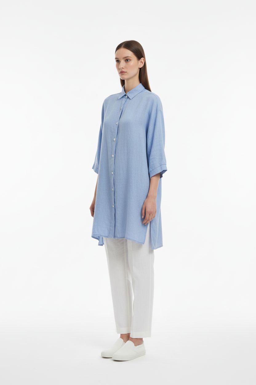 Camisa oversized de lino con corte relajado y estilo contemporáneo. Su diseño amplio y fluido, con bolsillos escondidos y junto con el tejido natural del lino, ofrece comodidad y frescura, mientras que la botonadura frontal y el cuello clásico mantienen un estilo minimalista. Perfecta para outfits urbanos o un look casual con actitud effortless.